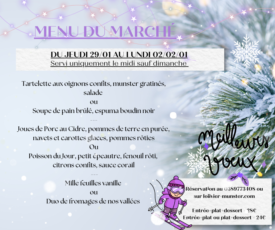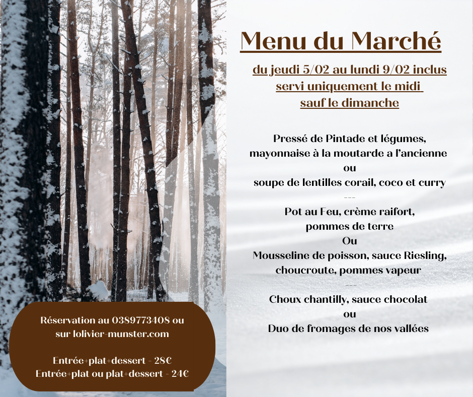 Du jeudi au lundi midi sauf dimanche et jour férié nous servons uniquement un menu du marché déclinable de 3 façons.